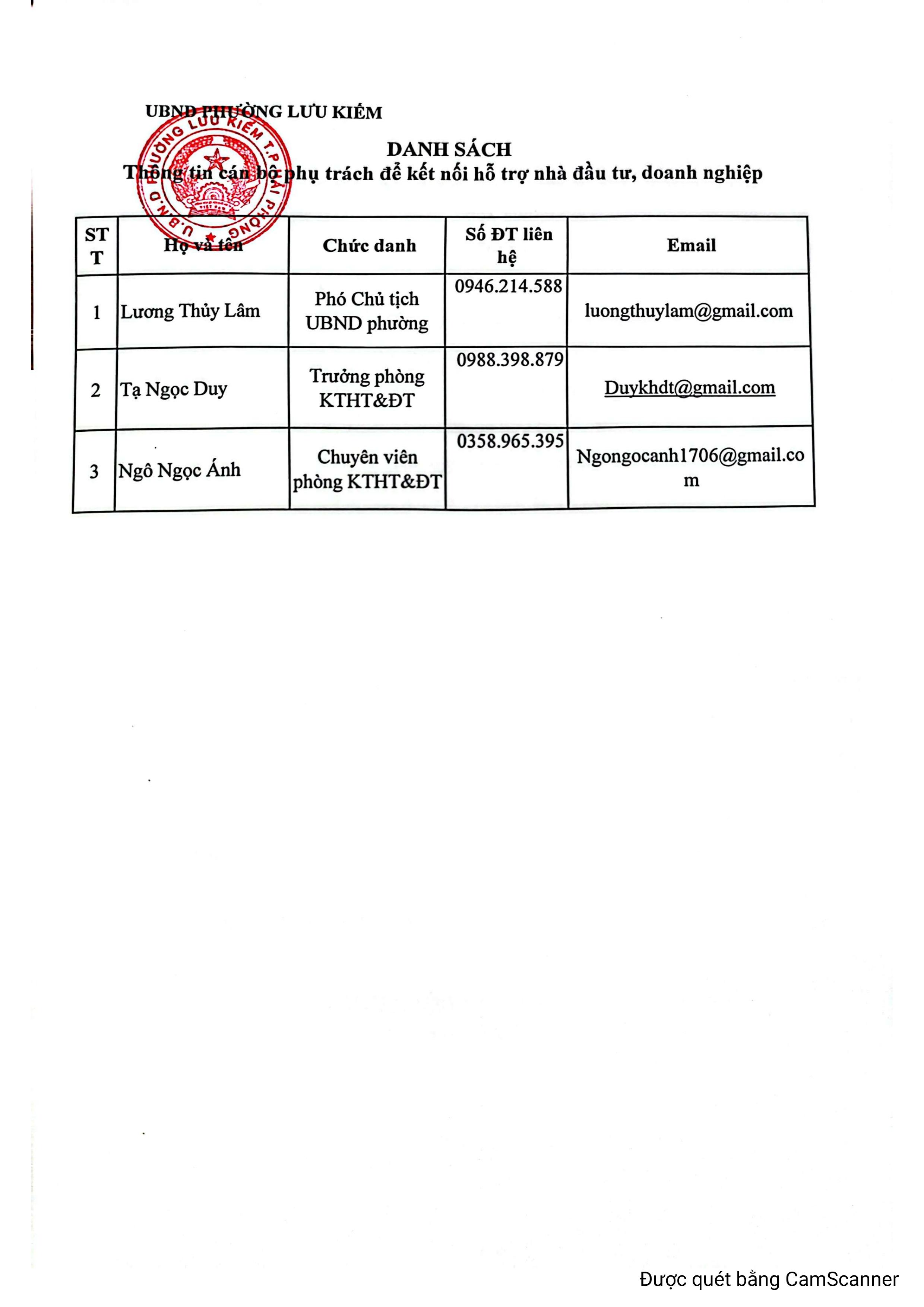 Thông tin cán bộ phường Lưu Kiếm phụ trách kết nối, hỗ trợ nhà đầu tư, doanh nghiệp